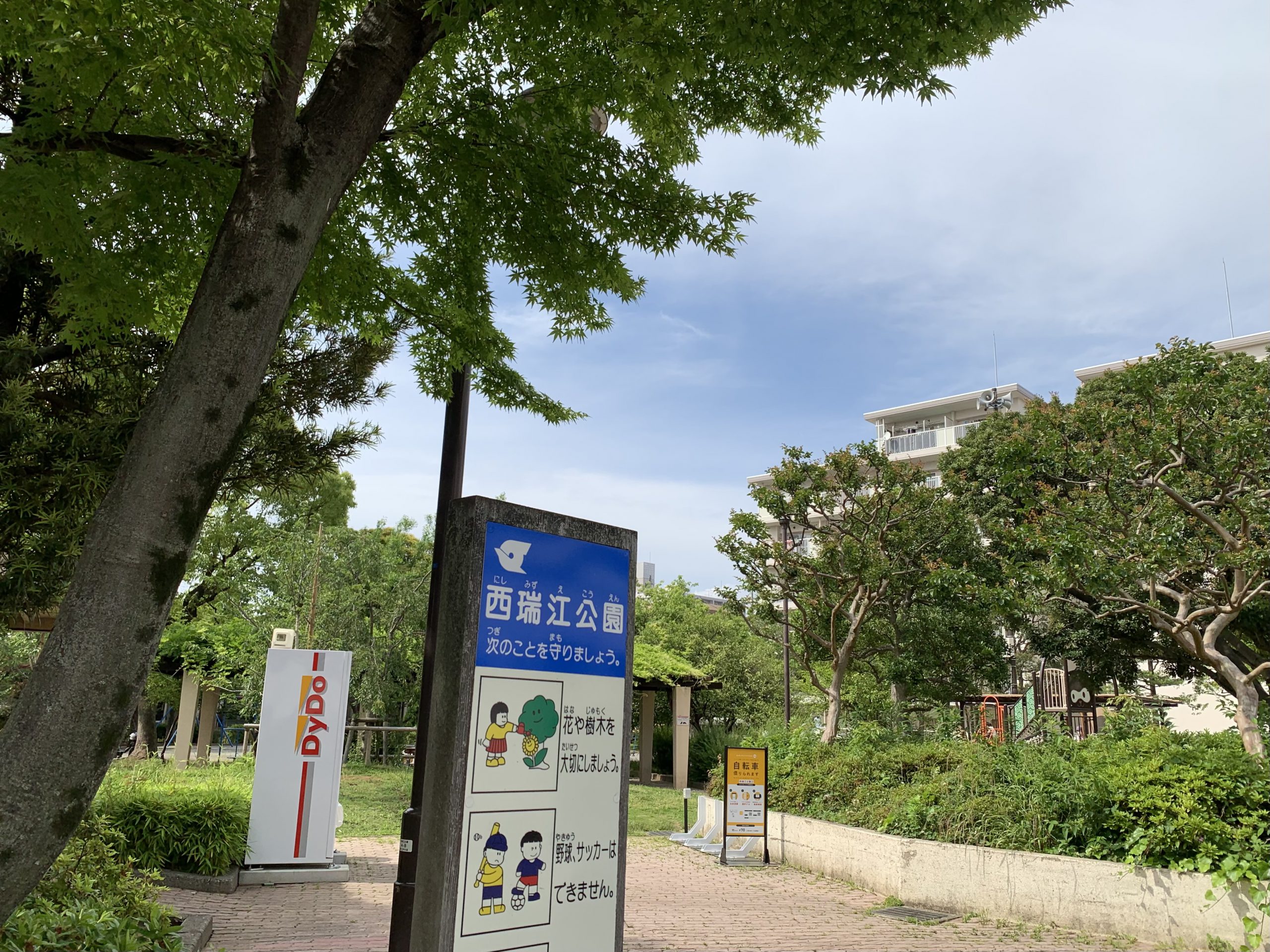 西瑞江公園は、葛西工業高校前交差点の近くにある、にぎやかな公園です。いつもお友達やママさんなどが利用していて、ひと休みするために訪れる人もたくさんいます。