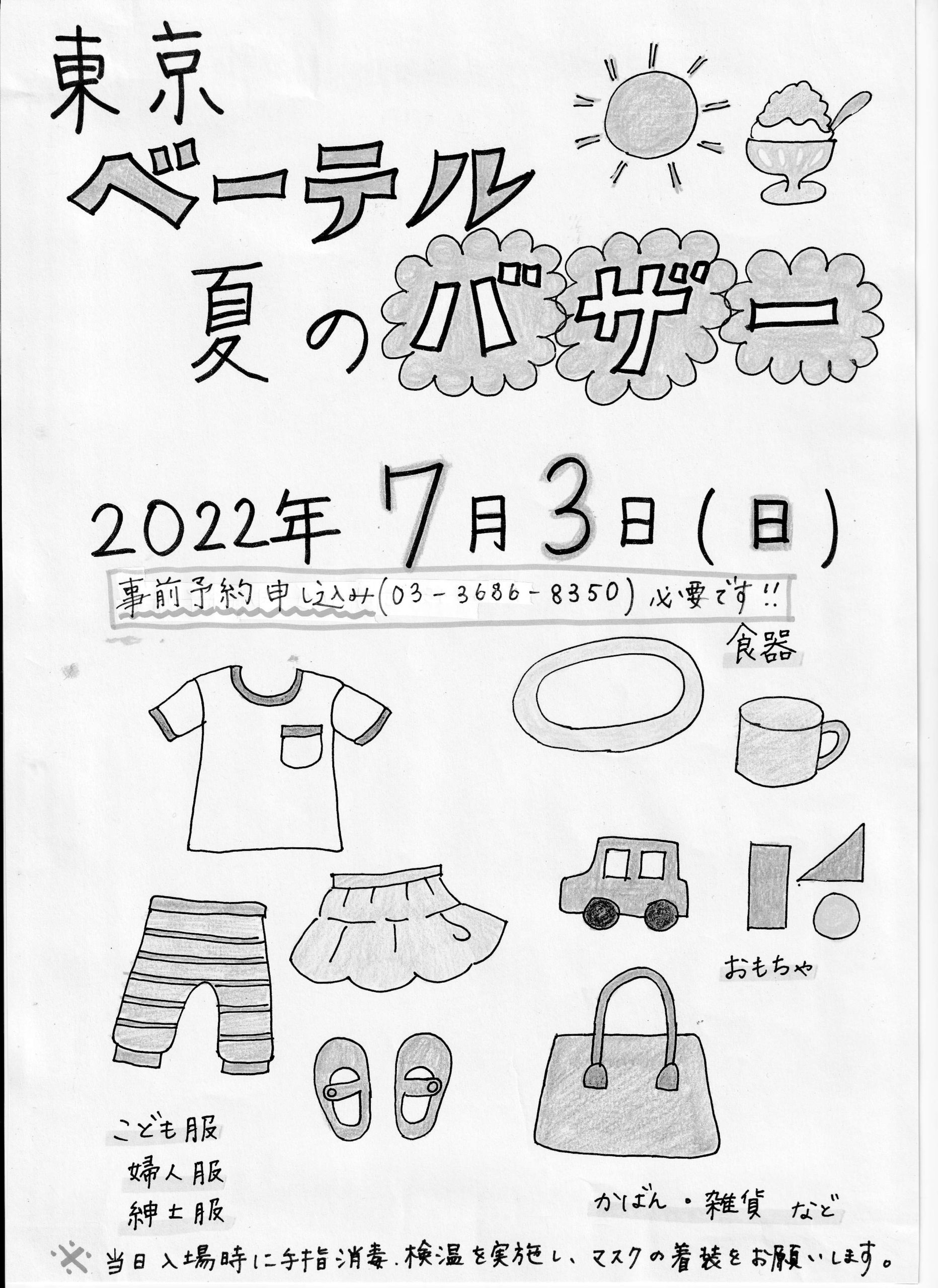 子育てひろば・相談室「ホッとスペース」を運営している東京ベーテルより、夏のバザーのお知らせです。