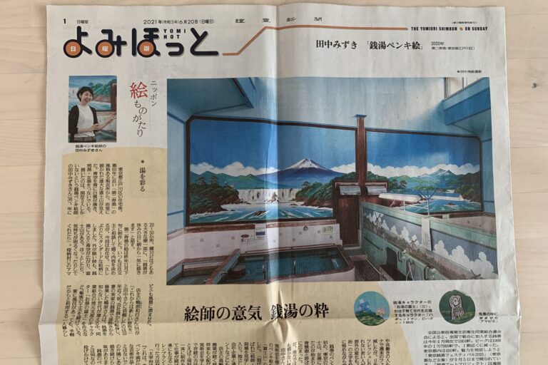 6月20日(日)の読売新聞にて、ハギュットマンとお湯の富士が紹介されました! 今回、こちらの絵を描いてくれたのは、銭湯ペンキ絵師の田中みずきさんです。 男湯・女湯どちらにも描かれていて、ひょっこり顔を出しているところが可…