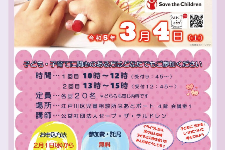 江戸川区みんなで考えるワークショップを開催します 公益社団法人セーブ・ザ・チルドレン・ジャパンの講師をお招きし、参加者みんなで考えるワークショップを開催いたします。 子育ては、楽しいこともたくさんあるけれど、大変なことも…