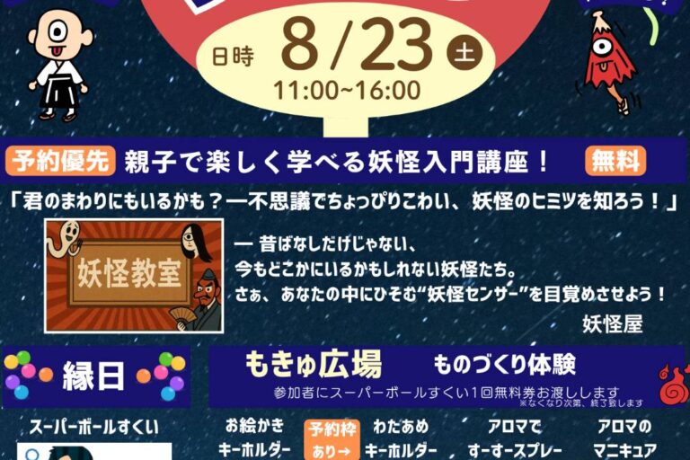 8月23日(土)芽育kids & もきゅ夏まつり2025 イベント開催告知, 地域イベント情報2025年7月23日 2020年夏に「子どもたちに、ご家族に、楽しいお祭りの体験を届けたい」との想いから始まりました。 今年は、習い事を広く浅く経験する学童「芽育kids」さんにお声がけ頂き、共同開催することになりました。 ・妖… 続きを読む