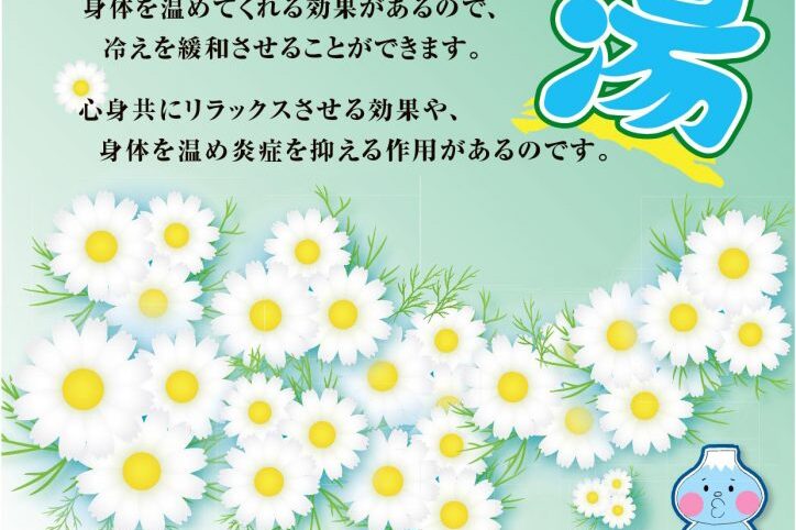 2021年4月25日(日曜日)は、江戸川区の銭湯イベント湯は、「カモミール湯(天然ハーブ)」を実施します。 カモミールは、身体を温める効果があり、貧血、冷え性を改善します。 心身共にリラックスさせる効果があり、身体を温め…