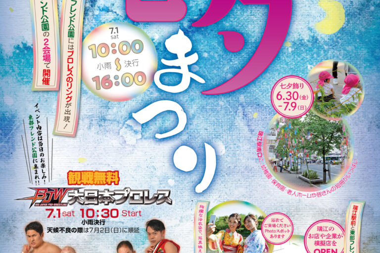 恒例の「瑞江 七夕まつり」。 今年は東部フレンド公園と瑞江駅前の2会場での開催。 東部フレンド公園には、なんと!プロレスのリングが出現!!熱いバトルが開幕! もちろん瑞江駅南口の七夕飾りも実施いたします。 一部のお店や企…