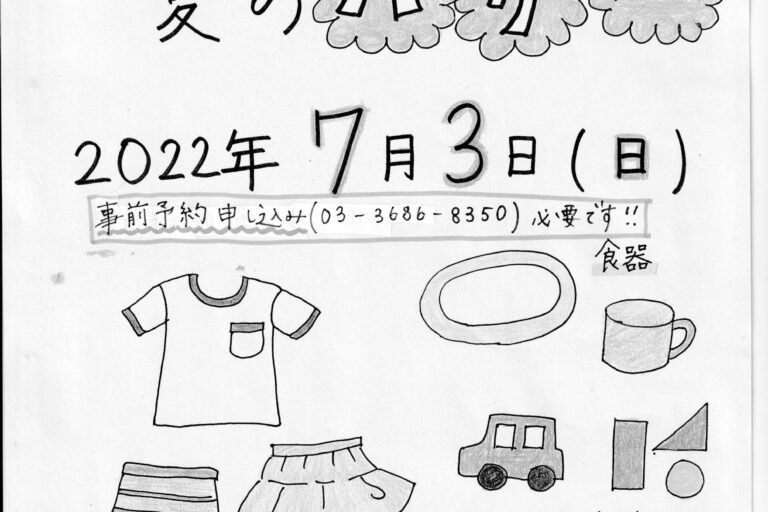 子育てひろば・相談室「ホッとスペース」を運営している東京ベーテルより、夏のバザーのお知らせです。 東京ベーテル夏のバザー 当日入場時に検温・手指の消毒、マスクの着装をお願いします。 バザーの品物は以下のようになっています…