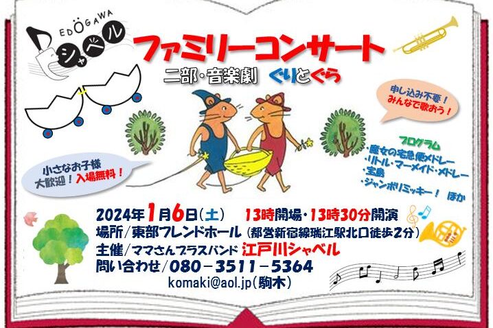 江戸川シャベルファミリーコンサート 開催のお知らせ 地域イベント情報2023年9月26日 江戸川区で活動しているママさんブラスバンド【江戸川シャベル】が開催するファミリーコンサート。 【江戸川シャベル】は、ママさんたちが音楽を楽しみながら子育てを共有することを目的に、その架け橋として音楽活動をし… 続きを読む