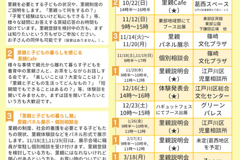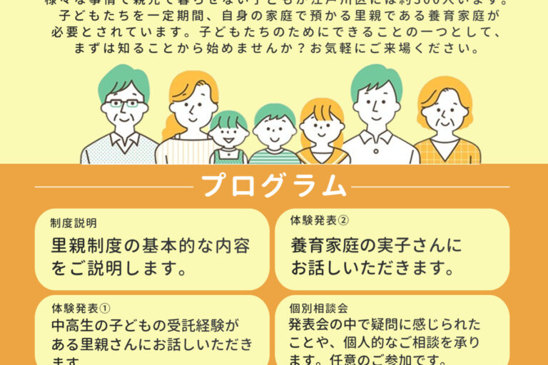 江戸川区では、里親や社会的養護を必要とする子どもについて理解を深めていただくためのイベントを多数予定しています! ご予約が必要なものは、Googleフォーム又はお電話(03-5678-1810 江戸川区児童…