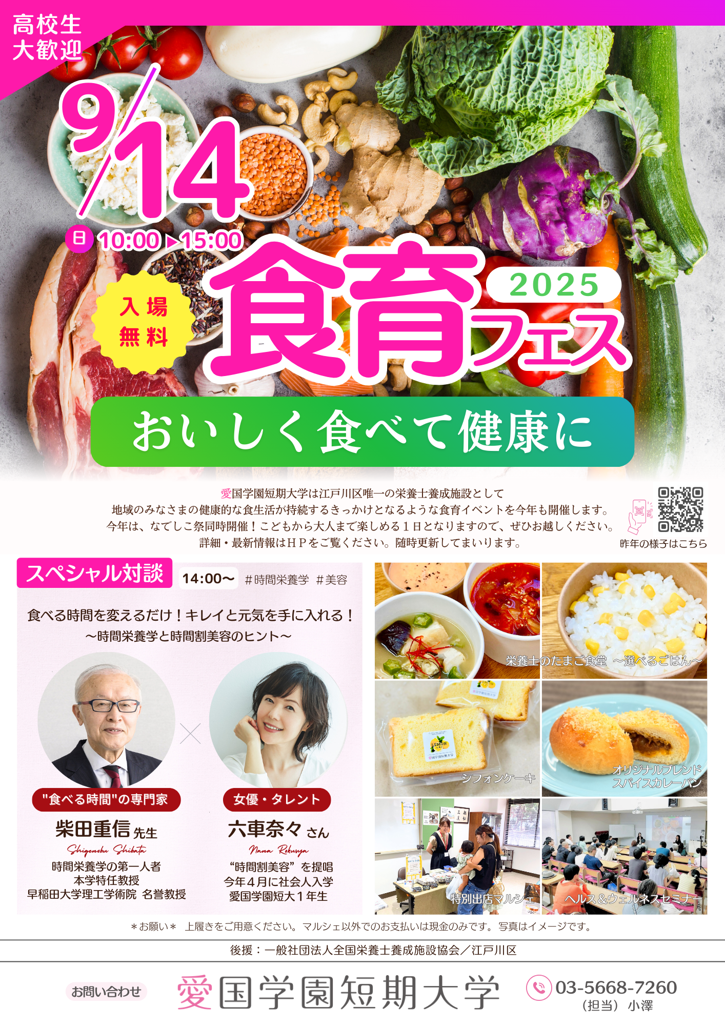 説明今年は『おいしく食べて健康に』がテーマです! 愛国学園短期大学は、江戸川区唯一の栄養士養成施設として、地域のみなさまの健康的な食生活が持続するきっかけとなるような食育イベントを今年も開催します。 *注目* 今年のスペシャ…