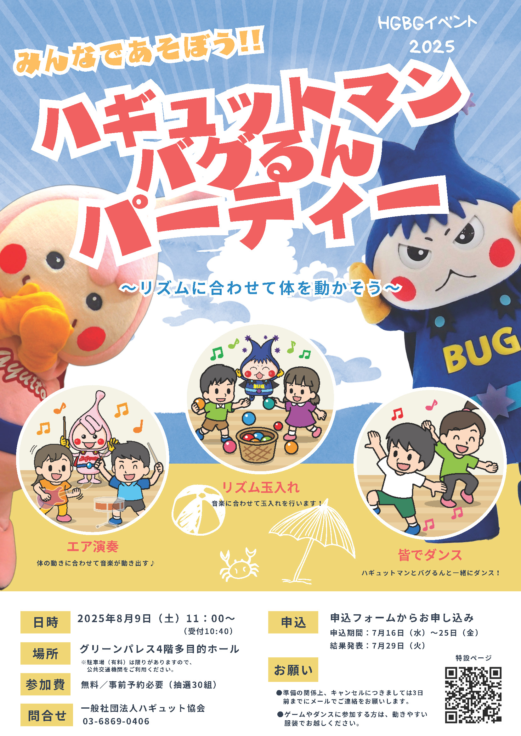 説明「リズムに合わせて体を動かそう!」がコンセプト。 ハギュットマンとバグるんと、音楽に合わせて色々な遊びをする内容です。「リズム玉入れ」、「エア演奏」、「みんなでダンス」をして、ハギュットマン&バグるんと一緒に楽しい時間を…