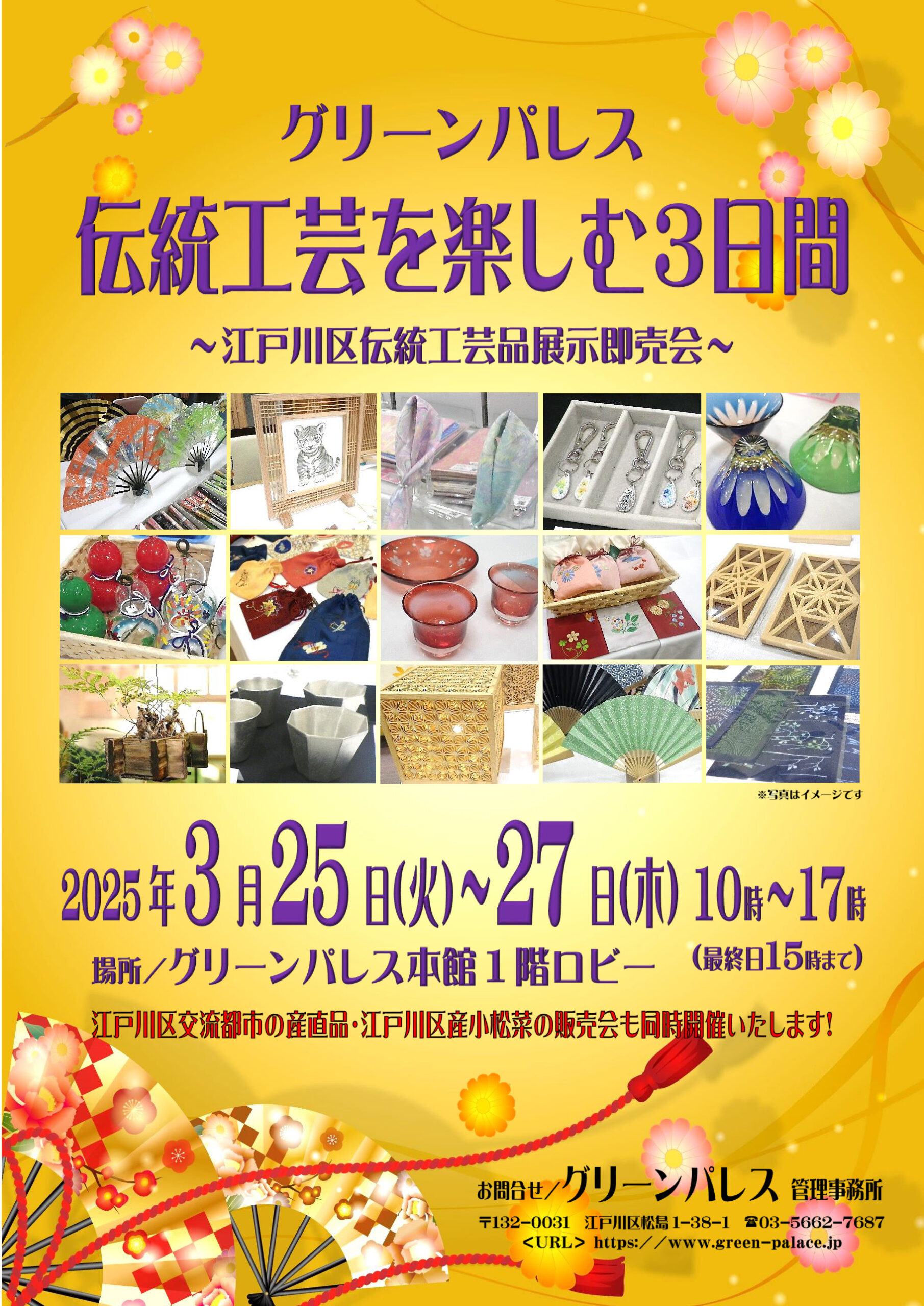 説明江戸川区伝統工芸品の展示・販売会を実施いたします。 この機会に江戸川区の匠の技をご覧ください。 交流都市の産直物産品の販売・江戸川区産小松菜の販売も同時開催いたします。 ■「伝統工芸を楽しむ3日間」イベント…