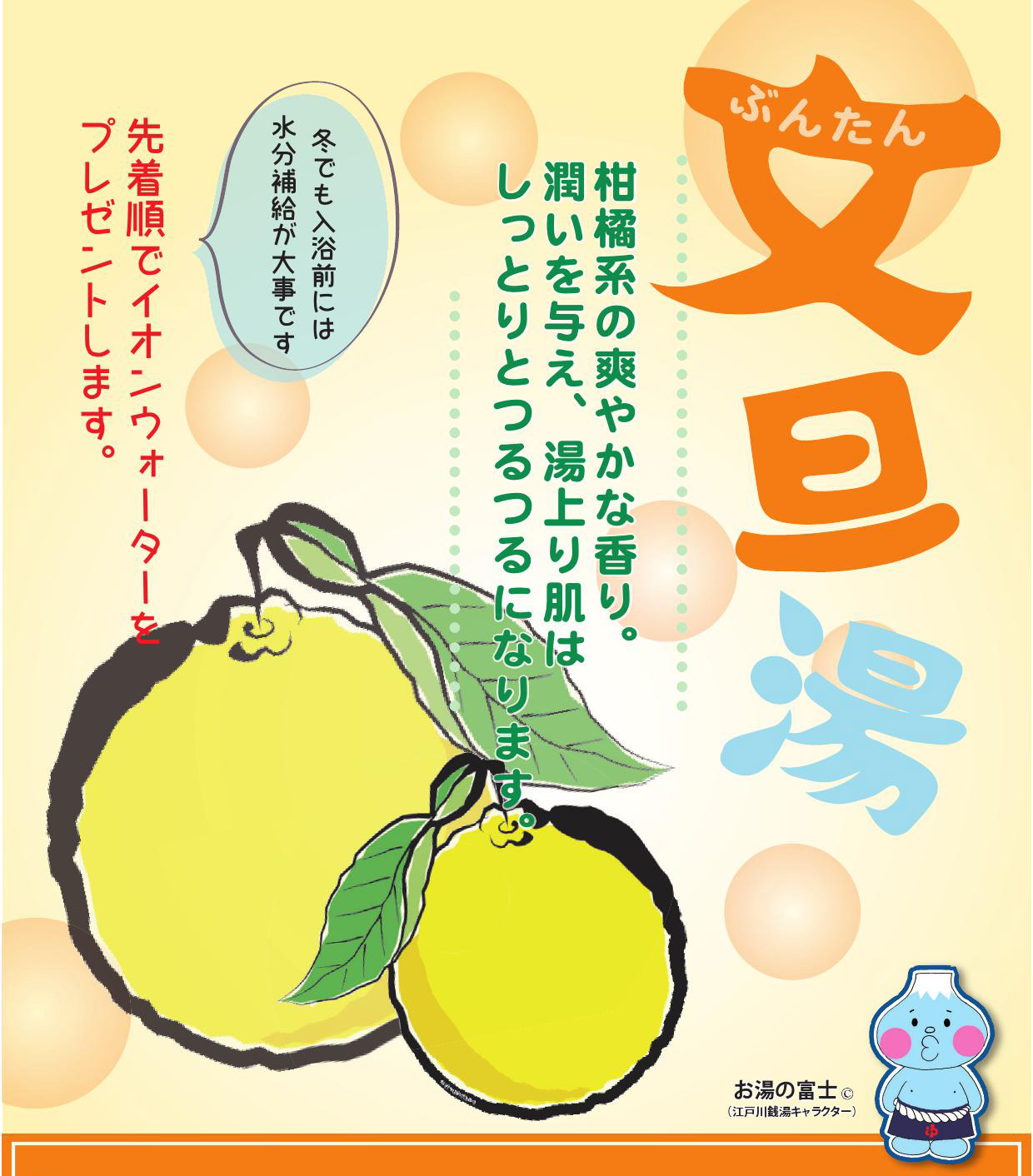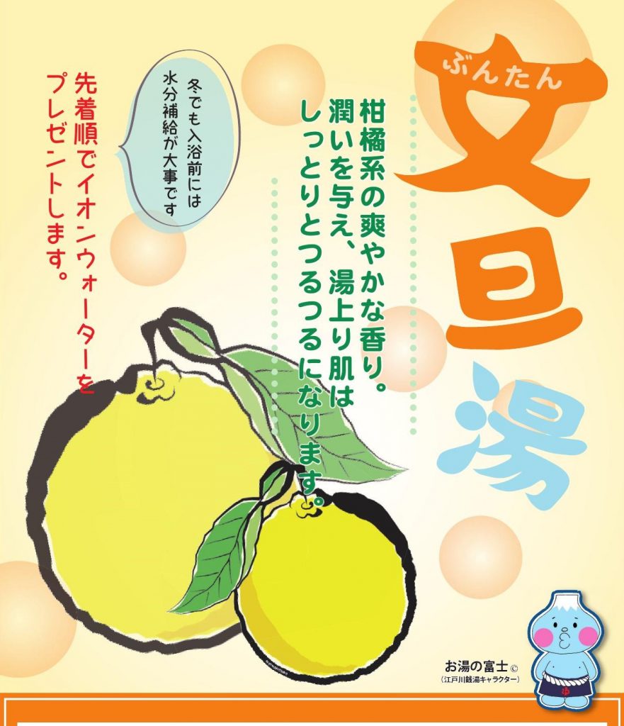 説明2021年2月28日(日)江戸川区にある銭湯では毎月のイベント湯の開催日です! 文旦(ぶんたん)は、柑橘系の爽やかな香りで、 ・潤い効果 ・お肌 しっとりつるつる といった効果をもたらします! 是非とも、大きなお風呂に浸…