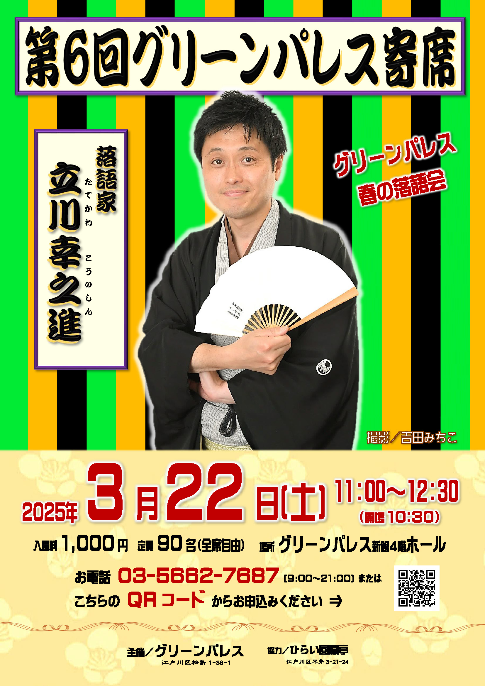 説明グリーンパレス春の落語会を開催いたします。 落語になじみのある方はもちろん、落語が初めての方も気軽にご参加いただけます。 ■「第6回グリーンパレス寄席」イベント概要■ 開催日:3月22日(土)…