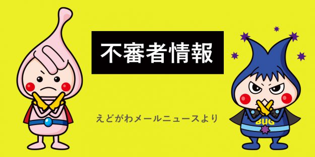 説明不審者情報(江戸川区教育委員会提供) 日 時:10月20日(水)午後5時頃 場 所:葛西地区(北葛西3丁目付近) 被害者:小学校第5学年男子3名、第5学年女子3名 状 況:公園で遊んでいたところ、携帯電話で写真を撮られた…